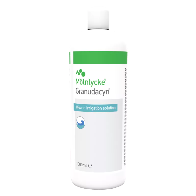 Granudacyn® to roztwór do irygacji do oczyszczania i nawilżania ostrych, przewlekłych i zanieczyszczonych ran, a także oparzeń pierwszego i drugiego stopnia. Kwas podchlorawy (HOCl) zapewnia bezpieczną konserwację i sprawia, że Granudacyn jest niezawodnym rozwiązaniem do irygacji ran.