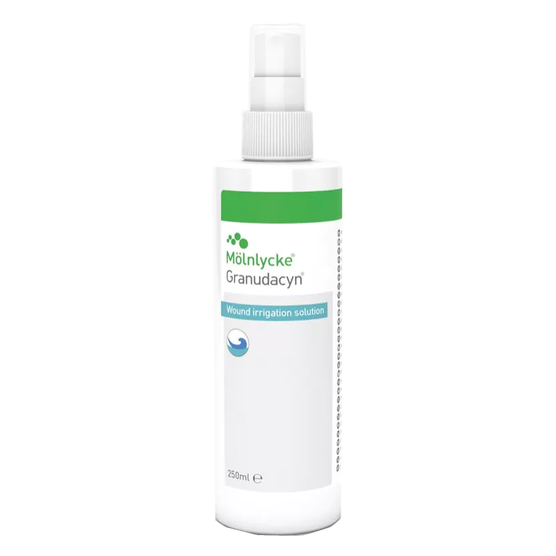 Granudacyn® to roztwór do irygacji do oczyszczania i nawilżania ostrych, przewlekłych i zanieczyszczonych ran, a także oparzeń pierwszego i drugiego stopnia. Kwas podchlorawy (HOCl) zapewnia bezpieczną konserwację i sprawia, że Granudacyn jest niezawodnym rozwiązaniem do irygacji ran.