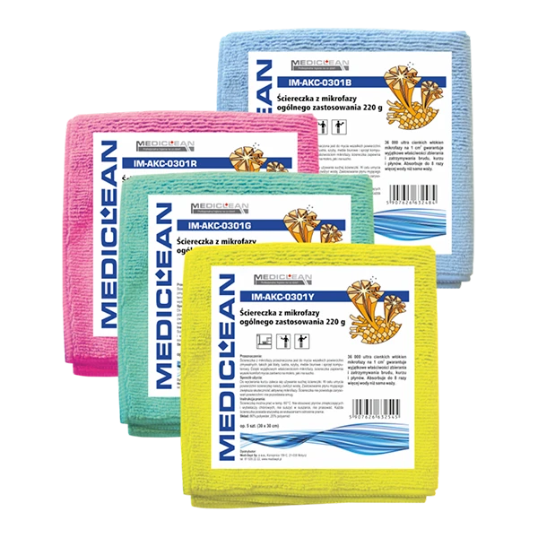 Ściereczka z mikrofazy ogólnego zastosowania przeznaczona do mycia wszelkich powierzchni zmywalnych takich jak blaty, lustra, szyby, meble biurowe i sprzęt komputerowy. Dzięki wyjątkowym właściwościom mikrofazy, ściereczka zapewnia wysoki komfort mycia zarówno na mokro, jak i na sucho. Gwarantuje wyjątkowe właściwości zbierania i zatrzymywania w swojej strukturze brudu, kurzu i płynów. Absorbuje do 8 razy więcej wody niż sama waży. Wytrzymałość: ok. 300 cykli prania. Ściereczki mają zawieszkę oraz wszywkę z informacją o sposobie użycia i instrukcję prania. Skład: 80% poliester, 20% poliamid. Dostępne kolory: czerwony, niebieski, żółty, zielony.