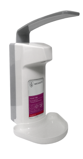 Ścienny dozownik łokciowy dostosowany do butelek o pojemności 500 ml. Regulowana ilość dozowanego preparatu od 1 do 3 ml. Z podstawką.