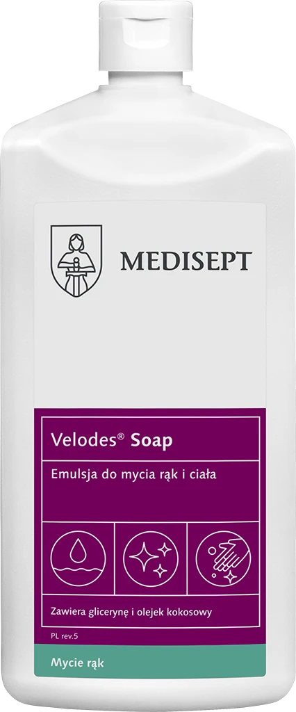 Velodes Soap to emulsja do mycia rąk, skóry głowy i całego ciała. Emulsja nie zawiera mydła, dzięki czemu może być stosowana u osób z alergią i nietolerancją na produkty na bazie mydła. Ze względu na zawartość składników pielęgnujących zalecana jest szczególnie dla personelu medycznego narażonego w wyniku częstego mycia na macerację skory. Emulsja polecana także do mycia pacjentów z odleżynami.