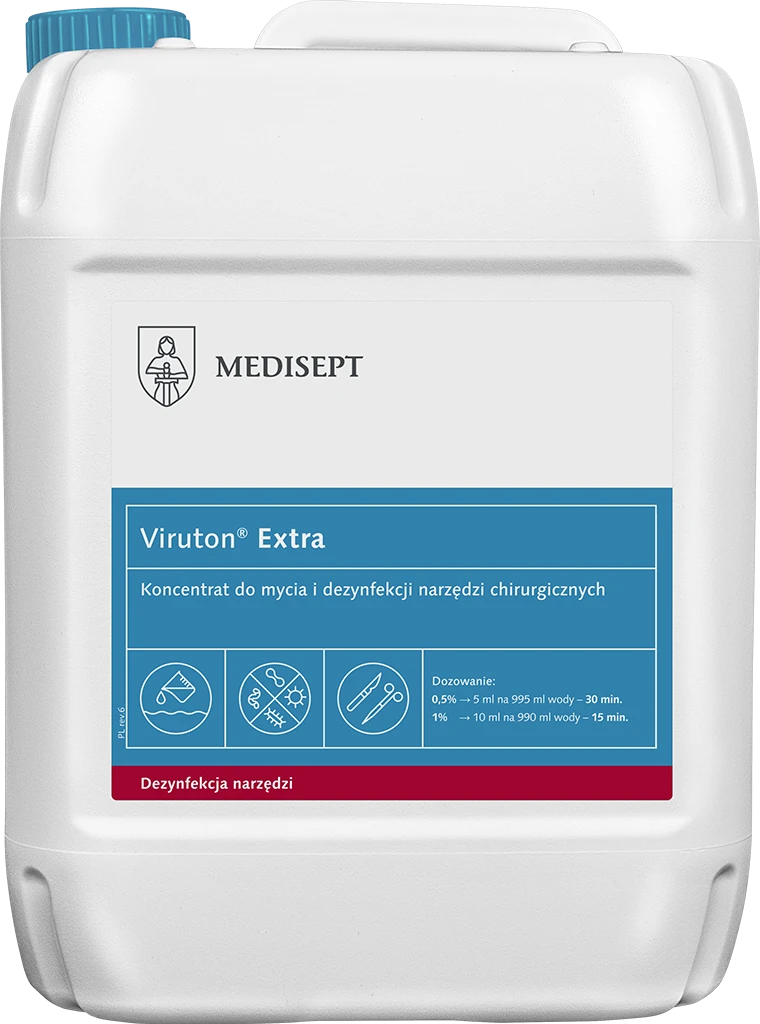 Viruton Extra to wydajny koncentrat przeznaczony do jednoczesnego mycia i dezynfekcji instrumentów chirurgicznych i rotacyjnych. Zawiera enzym - proteazę, dzięki czemu wykazuje bardzo dobre właściwości czyszczące. Skutecznie usuwa zaschnięte zabrudzenia organiczne. Przeznaczony jest do manualnej dezynfekcji narzędzi oraz dezynfekcji w myjkach ultradźwiękowych. Produkt wykazuje właściwości antykorozyjne i wysoką tolerancję materiałową. Jest zalecany do instrumentów ze stali szlachetnej, niklu, miedzi, aluminium, gumy, porcelany, szkła i tworzywa sztucznego.