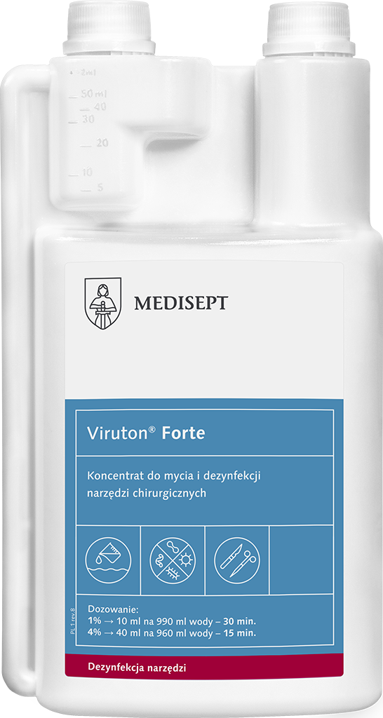 Viruton Forte to wydajny koncentrat przeznaczony do jednoczesnego mycia i dezynfekcji instrumentów chirurgicznych i rotacyjnych. Posiada bardzo dobre właściwości czyszczących i szerokie spektrum bójcze w krótkim czasie działania. Przeznaczony jest do dezynfekcji manualnej oraz w myjkach ultradźwiękowych. Produkt wykazuje właściwości antykorozyjne i wysoką tolerancję materiałową. Jest zalecany do instrumentów ze stali szlachetnej, niklu, miedzi, aluminium, gumy, porcelany, szkła i tworzywa sztucznego.